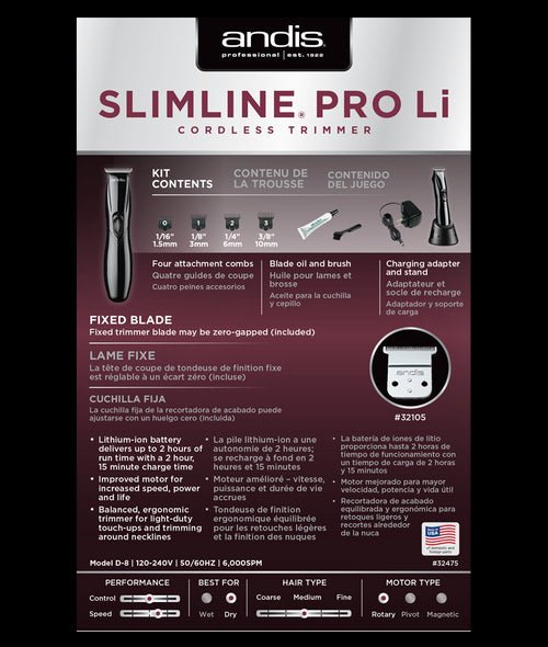 The Andis Slimline Pro Li Cordless Trimmer – Black combines sleek design, powerful performance, and professional precision in one lightweight tool. Featuring a lithium-ion battery for up to 2 hours of cordless runtime, this trimmer is ideal for outlining, edging, and detailed styling. Its close-cutting T-blade ensures sharp, clean lines, while the ergonomic slim body provides comfort and control during long grooming sessions. Designed for both barbers and home users, the Slimline Pro Li delivers smooth performance and long-lasting reliability — all in a stylish black finish.